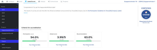 - In the "Labels/Scores" tab of your survey, find on the left the accreditation results for all your years of participation.