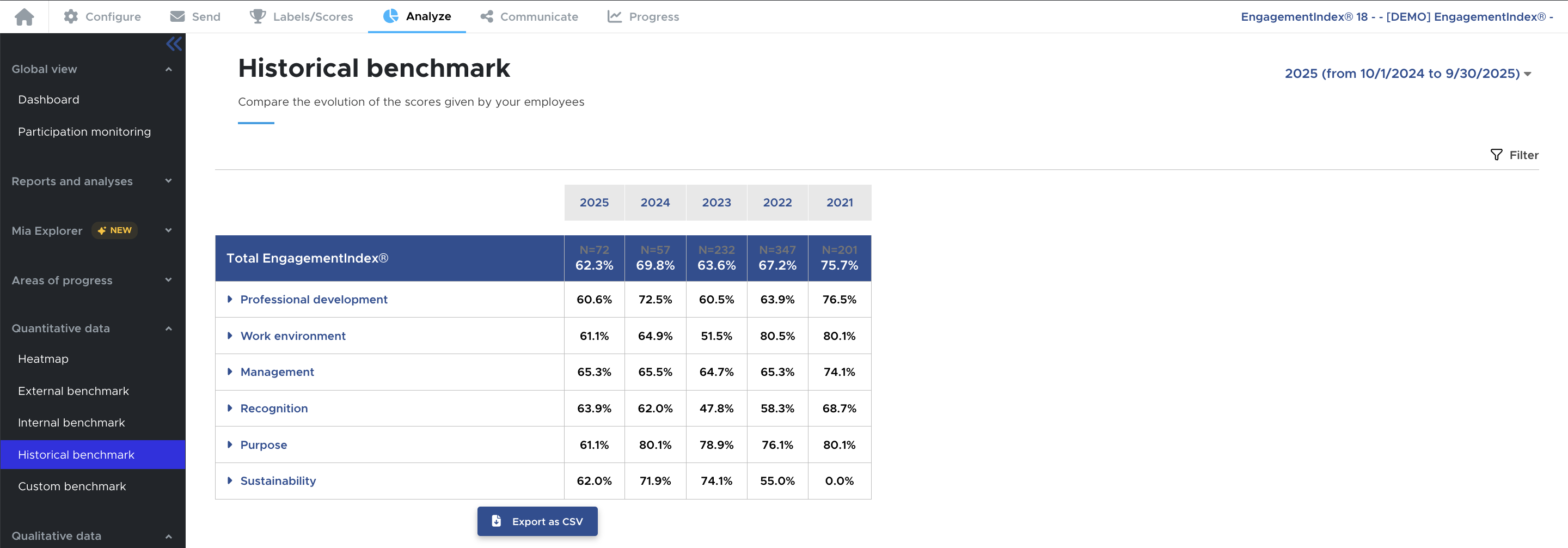 - Also, in the "Analyze" tab → "Historical Benchmark" find the evolution of your results across your different participations.