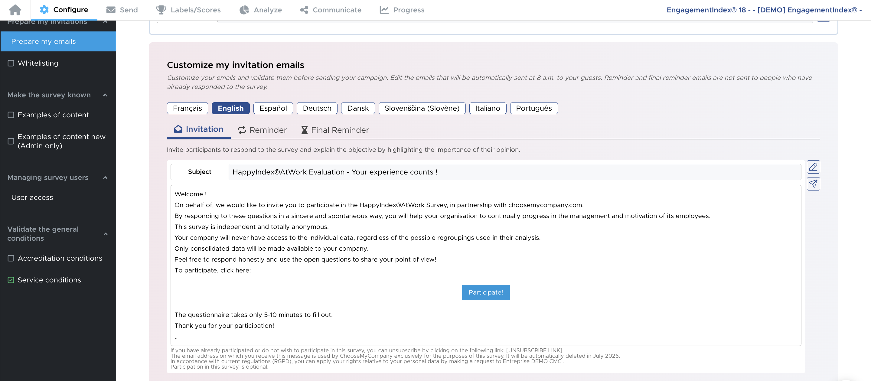 The invitation text templates are located in your survey → "Configure" → "Email templates."