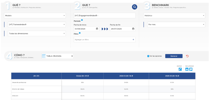 Ejemplo: Analizar mes a mes los resultados de su encuesta HappyIndex®Trainee (a partir de un mínimo de 5 encuestados).