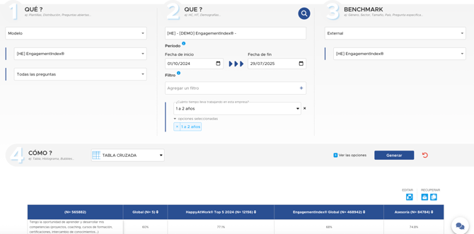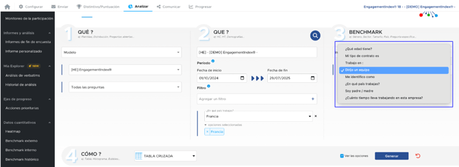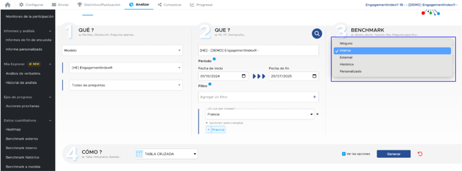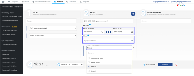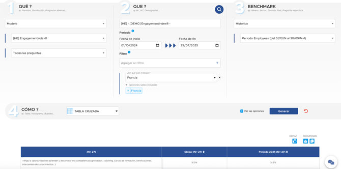 Aquí, después de hacer clic en "Generar", obtenemos los resultados de todas las preguntas del modelo EngagementIndex®, para la campaña 2025, en Francia, con una distribución entre managers y no managers.