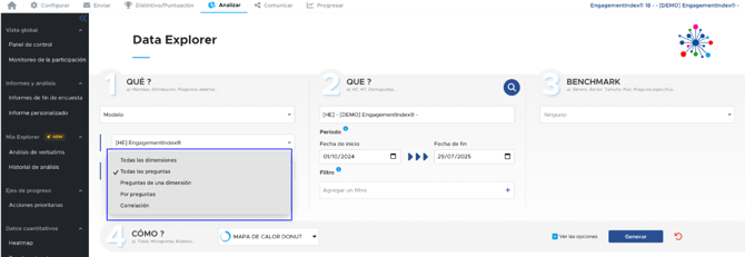 - Debe elegir qué desea analizar (preguntas cerradas, preguntas abiertas, preguntas adicionales, etc.).