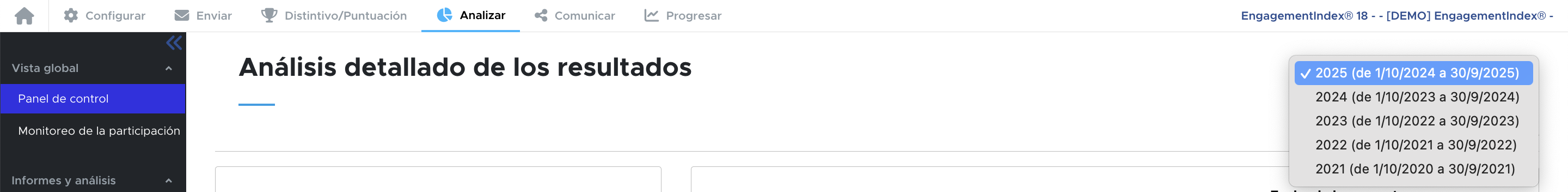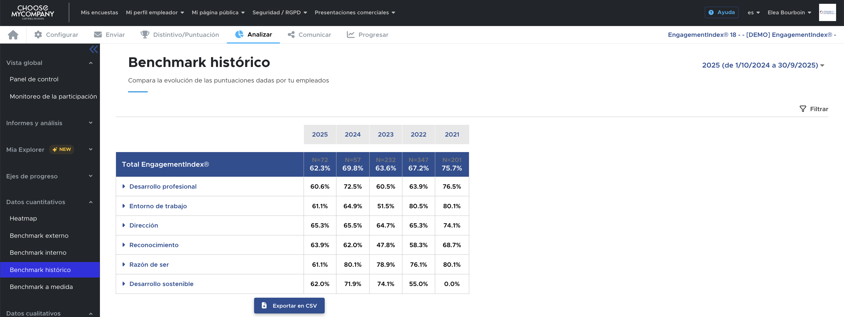 También encontrará en la pestaña "Analizar" → "Benchmark Histórico", la evolución de sus resultados a lo largo de sus diferentes participaciones.
