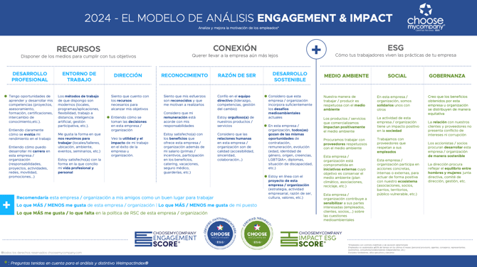 El cuestionario WeImpact®Index se articula en torno a 3 dimensiones, con 18 preguntas cerradas y 2 preguntas abiertas.