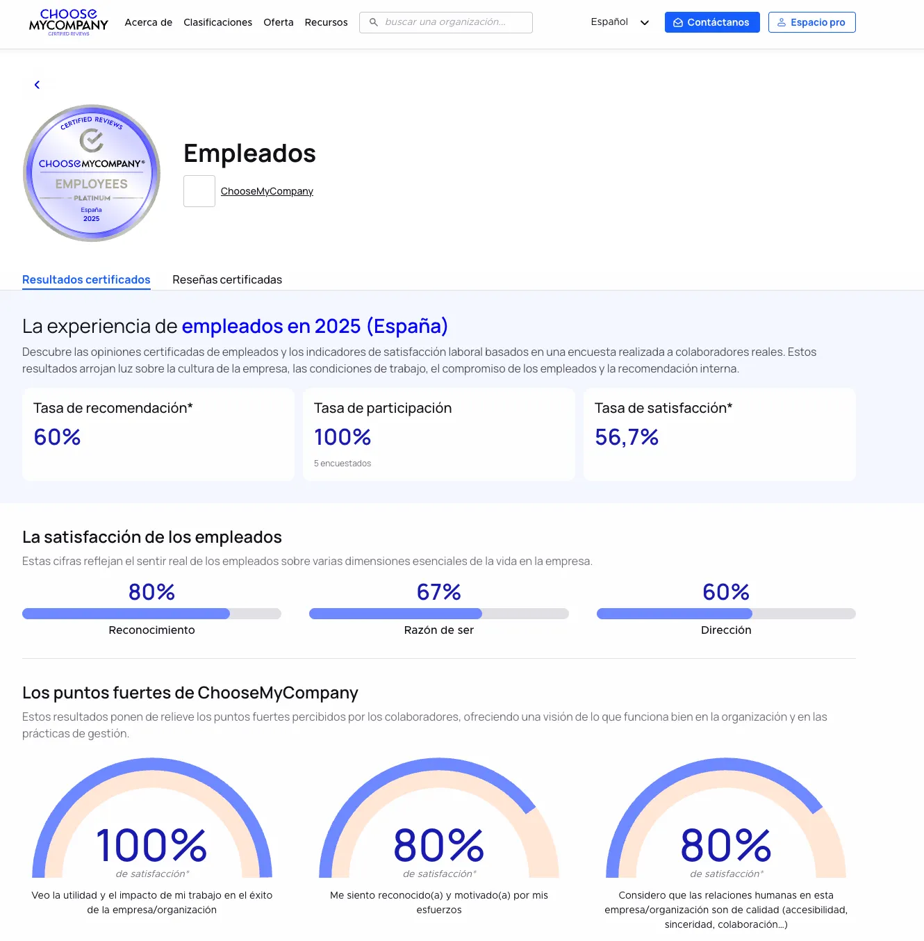 Tu página pública de ChooseMyCompany es el espacio dedicado a tu organización en nuestro sitio web público. Permite valorizar tus certificaciones y mostrar los mejores resultados de tus encuestas.