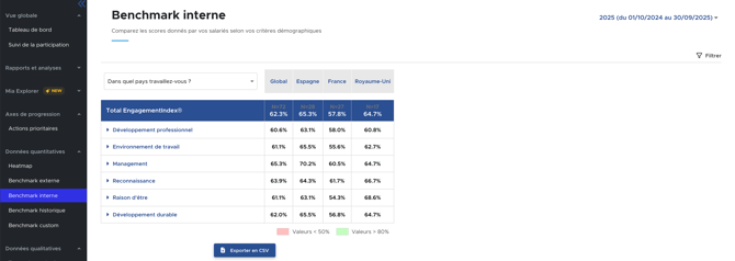 - Vous pouvez utiliser le benchmark interne dans le but de comparer vos populations entres-elles. Cette fonctionnalité vous permet notamment d'identifier de potentiels écarts d'engagement. Vous pouvez combiner le benchmark interne et les filtres sur la droite afin d'être encore plus précis dans votre analyse.