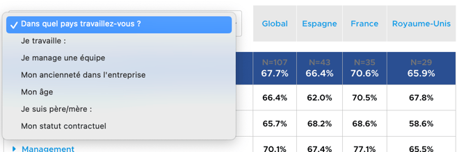 Le benchmark interne a pour objectifs de comparer les résultats entre vos populations, en fonction des questions démographiques que vous avez ajouté à votre questionnaire.
