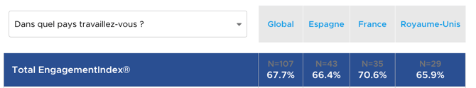 Vous pouvez également apporter un filtre supplémentaire en haut à droite. Vous pouvez par exemple regarder uniquement les résultats de la France et obtenir le comparatif des résultats par service.