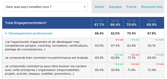 Par exemple ici, le taux de réponse favorable au sujet de l'opportunité d'apprendre au global est inférieur de 3 points par rapport aux résultats de l'Espagne.