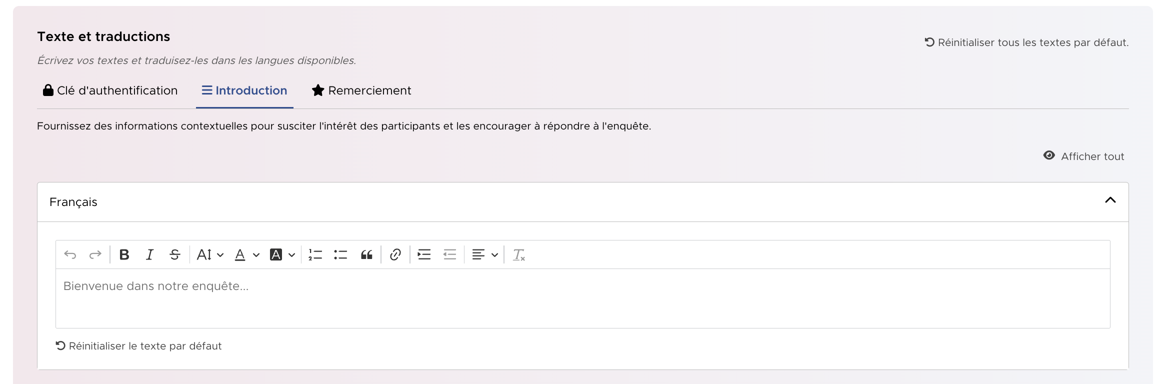 Nous proposons une version, mais celle-ci est modifiable. Il vous suffit de vous rendre dans les paramètres généraux de votre enquête.