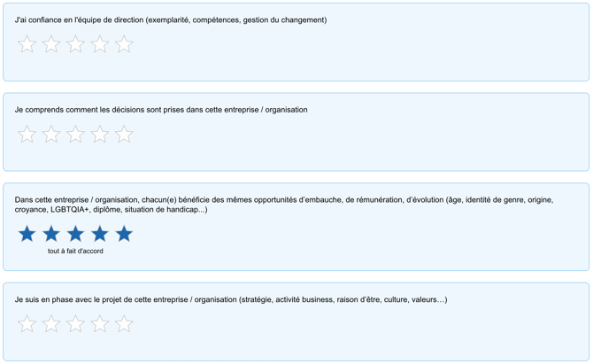 Ce modèle unique vous permet de comparer vos résultats à l'ensemble de nos entreprises participantes, sur des bases communes et nous permet de générer une accréditation avec des critères fixes.