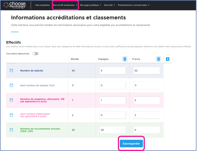 Pour cela, rendez-vous dans votre espace employeur, puis Informations accréditations et classements.