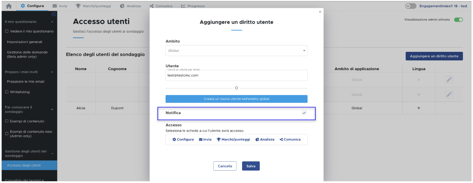 Quindi, è sufficiente selezionare o deselezionare la casella "Notifica", a seconda che si voglia attivare o disattivare la ricezione delle notifiche per quell’utente.