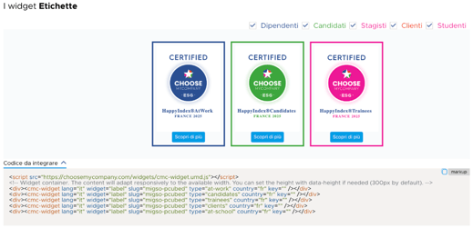 I widget si integrano tramite un codice JavaScript pronto all’uso.