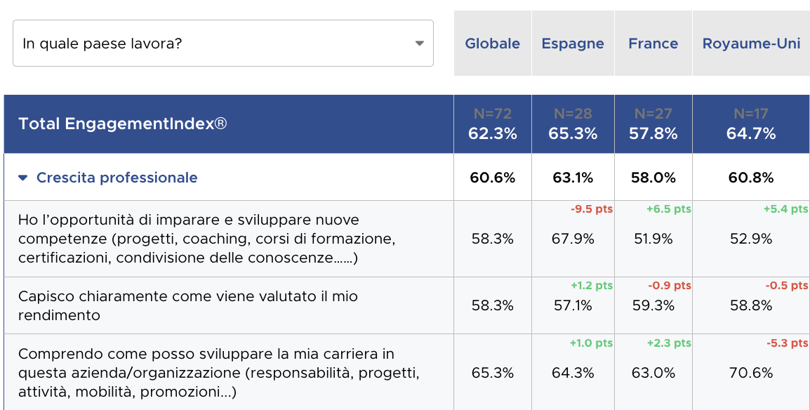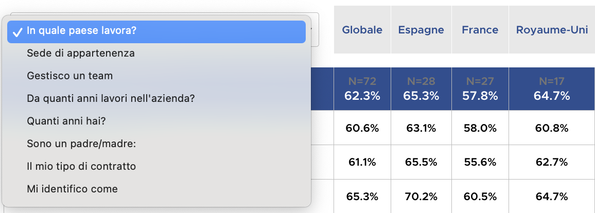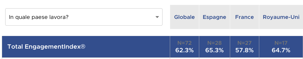 Potete anche applicare un filtro aggiuntivo in alto a destra. Ad esempio, potete scegliere di visualizzare solo i risultati della Francia e ottenere un confronto dei risultati per reparto.