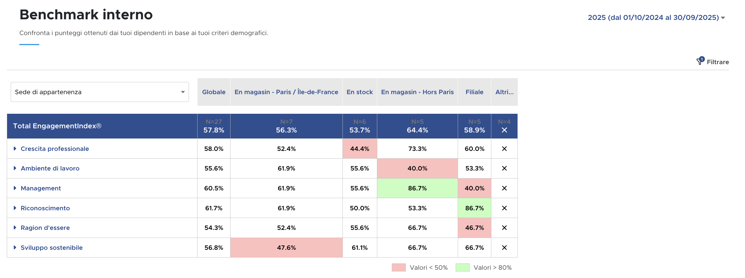 Il benchmark interno ha l’obiettivo di confrontare i risultati tra le vostre popolazioni, in base alle domande demografiche che avete aggiunto al vostro questionario.