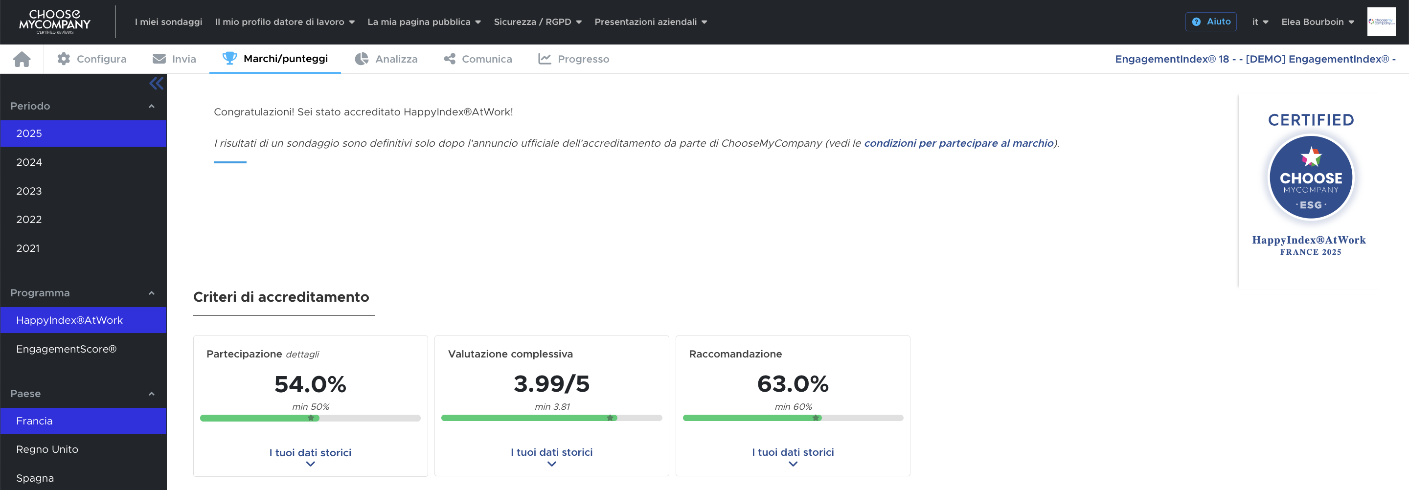 - Nella scheda "Marchi/Punteggi" della vostra indagine, troverete a sinistra i risultati di accreditamento di tutti gli anni di partecipazione.