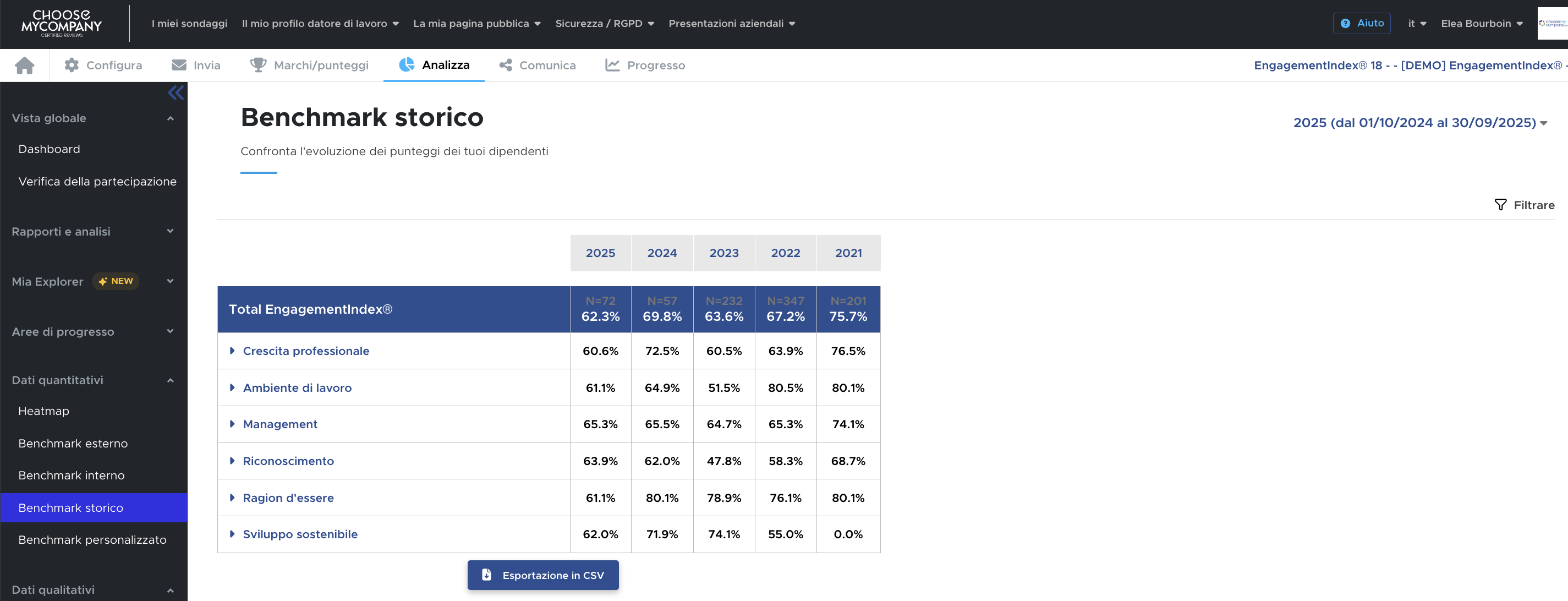 Troverete inoltre nella scheda "Analizza" → "Benchmark storico" l’evoluzione dei vostri risultati attraverso le vostre diverse partecipazioni.