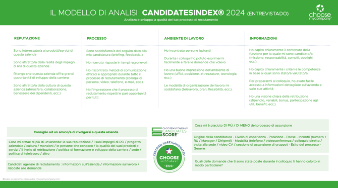 Questo questionario include un modello che porta all’assegnazione di un riconoscimento: HappyIndex®Candidates, che valuta il livello di coinvolgimento e analizza l’esperienza dei candidati su quattro grandi dimensioni: il processo, la cultura e l’ambiente di lavoro, la posizione e la CSR (Responsabilità Sociale d'Impresa).